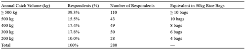 Table 1 presents data on fishing yields among Ilaje households. Results indicate that 39.3% of fishers harvest ≥500 kg annually, equivalent to about ten rice bags, while the majority (61%) record lower catches. This disparity highlights the influence of ecological conditions, access to productive waters, and fishing practices. The predominance of catches below 500 kg suggests subsistence-level livelihoods with limited savings potential. Evidence shows that small-scale fisheries in West Africa face persistent ecological and economic constraints (Neiland and Béné, 2010). In Ilaje, low yields exacerbate household vulnerability, reflecting broader challenges of climate change, overfishing, and habitat degradation that reduce fish stocks and undermine food security (FAO, 2022). Recent studies confirm that Nigerian coastal communities experience poverty and food insecurity linked to declining fisheries (Oparinde et al., 2025). Nonetheless, higher yields among some fishers demonstrate the potential of improved resource governance, climate adaptation, and livelihood diversification to strengthen resilience (Elezuo et al., 2024). Without such interventions, Ilaje fisheries risk further decline, deepening socio-economic hardship.