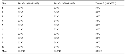 Table 6 Decadal maximum temperatures for Ilaje LGA coastal waters Source: Nigerian Meteorological Agency (NiMet), 2025 |
