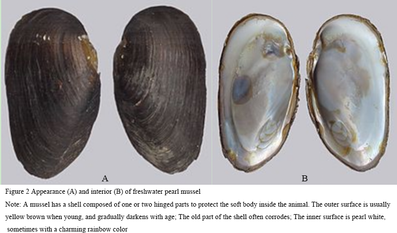 Figure 2 Appearance (A) and interior (B) of freshwater pearl mussel Note: A mussel has a shell composed of one or two hinged parts to protect the soft body inside the animal. The outer surface is usually yellow brown when young, and gradually darkens with age; The old part of the shell often corrodes; The inner surface is pearl white, sometimes with a charming rainbow color |