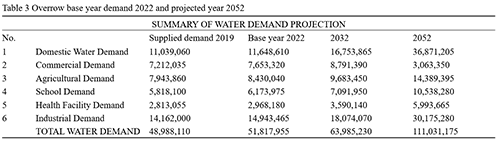 The total water demand, which was projected to rise steadily from about 52 × 106 m³ in 2022 to nearly 260 × 106 m³ by the year 2052. This increase reflects growing population pressure, industrial expansion, and agricultural intensification.
