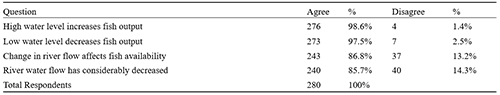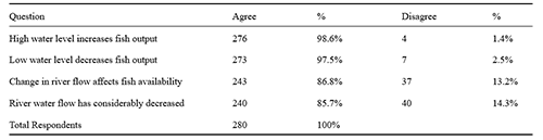 Table 2 illustrates fishermen’s perceptions of hydrological influences on fish catch volumes in Ilaje coastal waters. An overwhelming majority (98.6%) affirmed that high water levels enhance fish output, while 97.5% reported that low water levels reduce catches. This consensus reflects a clear understanding of the direct link between water availability and fishing productivity, consistent with established fisheries research (Welcomme, 2011). Furthermore, 86.8% acknowledged that river flow variations affect fish availability, and 85.7% observed significant declines in recent years, attributed to reduced rainfall, climate variability, and anthropogenic disruptions (Nwosu et al., 2022). These findings underscore that declining water levels pose both ecological and livelihood threats. Reduced flows diminish breeding grounds, nursery habitats, and migration corridors, undermining fish productivity and household income (FAO, 2022; Olusola et al., 2022). Addressing these challenges requires integrated water management, climate adaptation, and ecosystem conservation. Such interventions are vital for sustaining fisheries and safeguarding livelihoods in Ilaje LGA, where artisanal fishing remains central to food security and resilience (Ogunrayi et al., 2024).