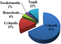 The density of zooplankton ranged between 185 ind./m3 during March 2010 to 32856 ind./m3 during July 2009 at St. 3 (Al-Musab) (Figure 3). The average density of zooplankton was 12940 ind./m3 in the study area during July 2009 and 5216 ind./m3 during March 2010 (Table 1 and Table 2). Crustaceans were the dominant of the total zooplankton in seven stations respectively (82.8%, 95.3%, 69.7%, 85.3%, 94.5%, 19.3% and 88.0%). Copepoda constitute (76%) of the total zooplankton. The second important group was Bivalve (9%), then Rotifera (6%), whereas Cirripede larvae and Appendicularia (2%) followed by the other zooplankton (5%) (Figure 4). Among Copepoda, Calanoid was the dominant group in all stations (67%). Then Cyclopoida (15%), nauplii (12%), Harpacticoida (4%), and Poecilostomatida (2%) of total Copepoda (Figure 5).