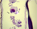 Figure 5 Showing stained gill tissue infested with Amyloodinium ocellatum ( trophont stage) Geimsa X100 |