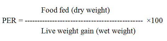 PER is defined as the gain in weight of fish per g of crude protein fed and calculated (Castell and Tiews, 1980) as: