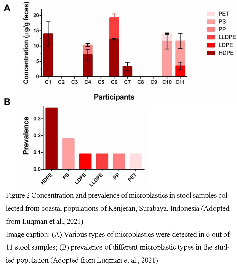Figure 2 Concentration and prevalence of microplastics in stool samples collected from coastal populations of Kenjeran, Surabaya, Indonesia (Adopted from Luqman et al., 2021) Image caption: (A) Various types of microplastics were detected in 6 out of 11 stool samples; (B) prevalence of different microplastic types in the studied population (Adopted from Luqman et al., 2021) |