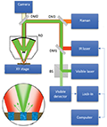 Figure 1 Schematic diagram of O-PTIR spectroscopy. A pulsed tunable IR laser is collinear with the visible detection laser, and the beams are focused via dichroic mirrors (DM1-3) on the sample surface through a reflective objective (RO). When IR absorption occurs, the photothermal response of the sample surface is monitored by the visible probe laser. The reflected light passes through a beam splitter (BS), is measured by a visible detector, and the IR signal is extracted while sweeping the wavelength of the IR laser source. Raman-shifted light is simultaneously diverted to the Raman spectrometer (Adopted from Böke et al., 2022) |